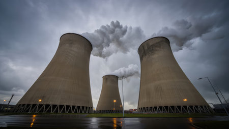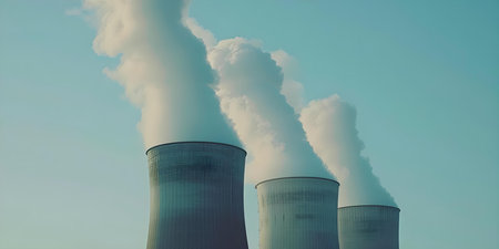 Massive cooling towers of a nuclear power plant release steam under dramatic cloudy sky, symbolizing energy and industry. Generative AI.