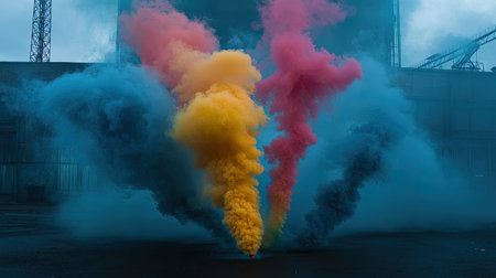 A dramatic scene with thick clouds of colored smoke billowing from a smoke bomb, set against an urban or industrial backdrop for a striking visual.
