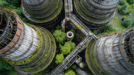 An aerial shot captures the stunning contrast between abandoned industrial silos and the vibrant greenery reclaiming the area, highlighting nature's resilience.