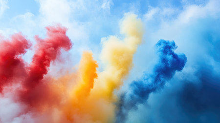 A stunning display of vibrant colored smoke billowing into a blue sky, creating an abstract and artistic atmosphere perfect for creative projects and visual inspiration.