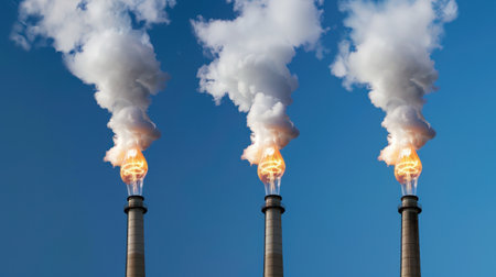 Three industrial smokestacks rise against a blue sky, emitting white smoke and showcasing energy production in an urban landscape.