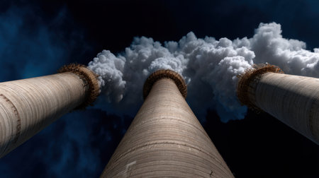 A dramatic view of towering industrial chimneys surrounded by thick smoke and an overcast sky, creating a haunting atmosphere that emphasizes pollution.