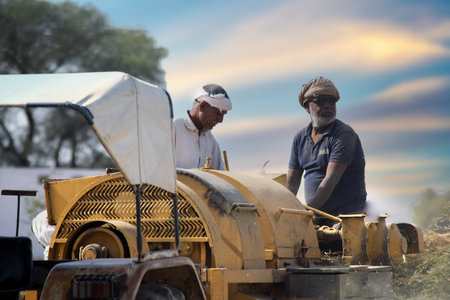 old farmers standing on a tractor wearing traditional indian clothes turbans and puttig grain into a tractor to seperate husk from wheat after harvest in punjab, rajasthan