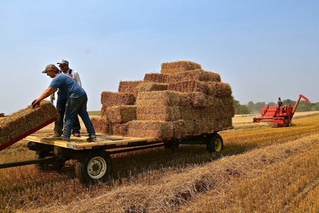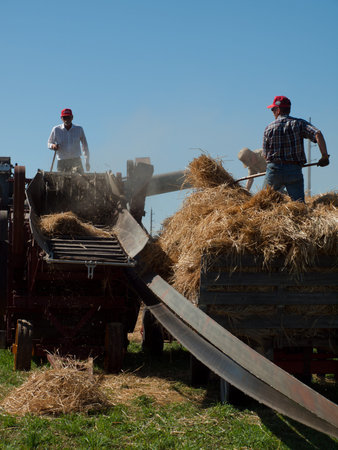ROLLAG, MINNESOTA, Sept 2, 2017: Unidentified men stack bales on a rack in field demonstrations at the annual WCSTR farm show in Rollag held each Labor Day weekend where 1000's attend.