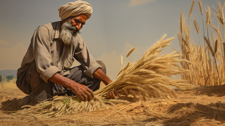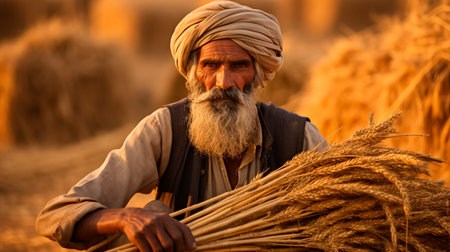 a man with a beard and turban holding a bundle of wheat