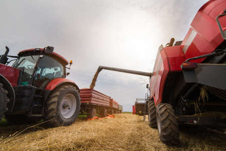 Tractor pulls up for loading to the combine with wheat