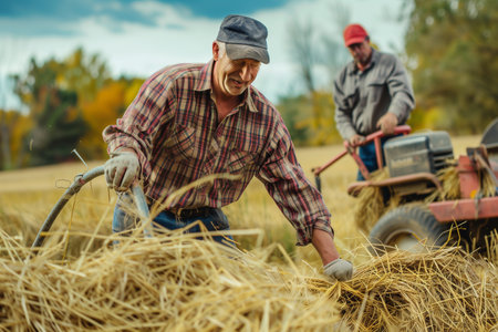 A farmer in a straw hat manually baling hay with a pitchfork and large hay bales scattered across a vast wheat field, showcasing rural agricultural practices.. AI Generation