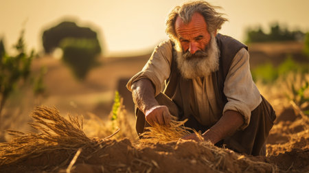 Greek farmer toils in earth-toned toga.