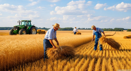 A scene contrasting traditional and modern agriculture, featuring farmers harvesting golden wheat with manual scythes in the foreground while a large modern tractor works in the background. The image symbolizes the evolution of farming techniques under a sunny blue sky.