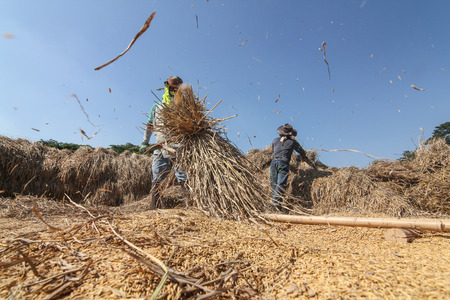 CHIANG RAI, THAILAND - December 14, 2016: : unidentified Thai farmer threshing by beating rice to separate seed from the trunks on the ground.