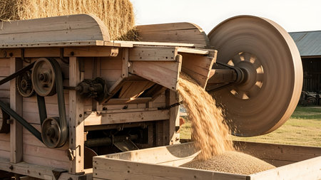 The a wooden grain mill in operation, processing wheat into flour. The mill a large wooden wheel mechanism with metal gears and belts, showing a vintage and rustic Wheat is being fed into the mill, and flour is flowing out into a container below. The setting appears to be outdoors in a rural or countryside environment, with natural light highlighting the textures and details of the wooden and metal components. The scene evokes a sense of historical agricultural practices and manual labor.