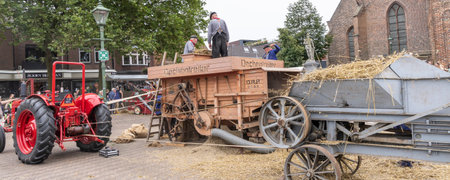 Barneveld, The Netherlands - August 1, 2024: Demonstration of harvest of grain and straw at traditional Veluwe market during the summer months in Barneveld Gelderland province in The Netherlands