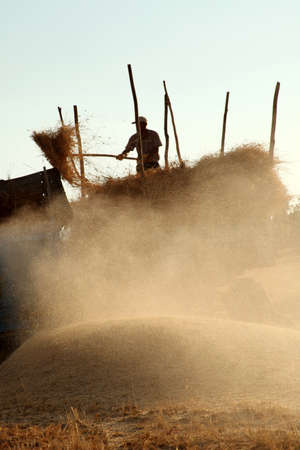 Throwing wheat into a threshing machine with pitch forks