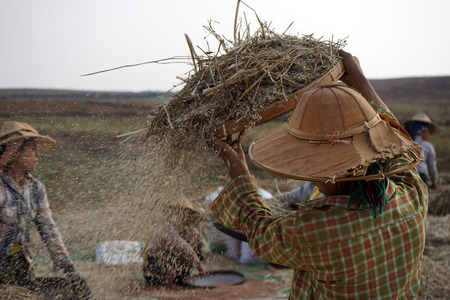Woman with straw on the farm field in Myanmar