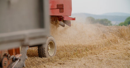 Close-up view of barley pouring from a harvester pipe into a trailer during harvest season on a farm field