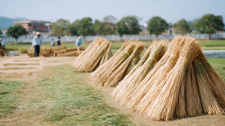 farmers harvest wheat rice by hand. close-up shot. soft-focus and over light in the background