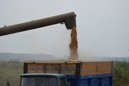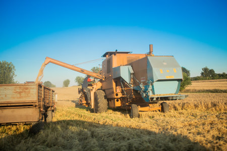 Combine harvester load wheat in the truck at the time of harvest in a sunny summer day