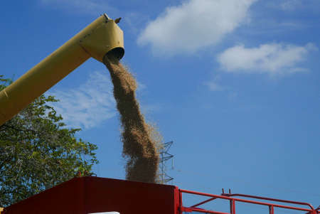 Overloading grain harvester into the grain tank of the tractor trailer.