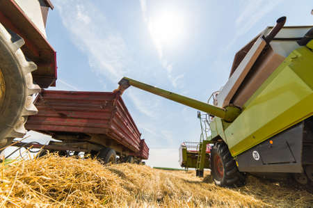 Unloading grain from a combine into a truck. Agricultural machinery for harvesting from the fields.
