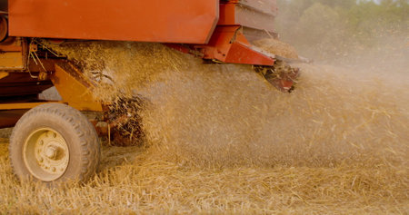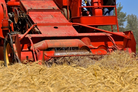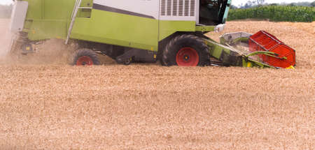 close-up of a combine harvester on a grain combine processes ripened wheat into grain.Agriculture.