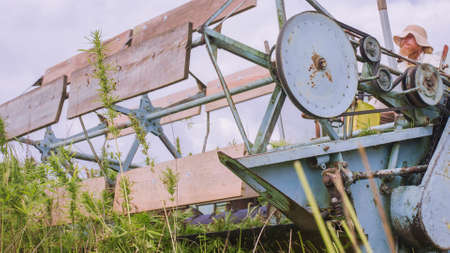 Farmer harvesting Hemp with combine on a field outside. Cannabis sativa plants rich with Cbd.