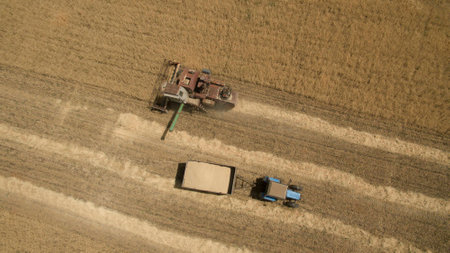 Unloading grains into truck by unloading auger. Combine harvesters cuts and threshes ripe wheat grain. Wheat harvesting on field in summer season. Process of gathering crop by agricultural machinery