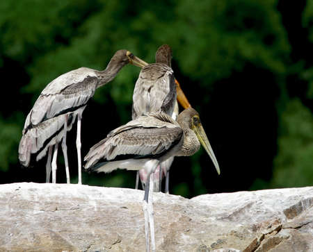 Close up shot of a painted stork sitting on a rock scratching it's ear