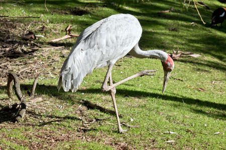 Closeup of a Wattled crane, grus carunculata, bird foraging in a green meadow