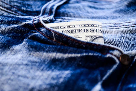Dollar banknote in pocket of jeans, closeup. Spending money