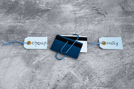 Cheap vs Costly prioduct price tags next to payment cards, money and consumer behaviour conceptual image