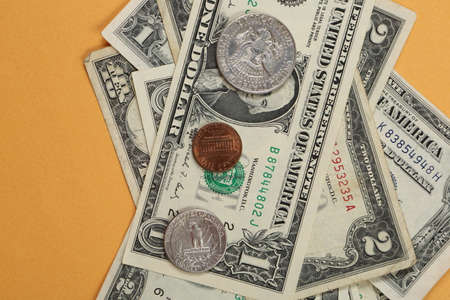 One cent coins and One Dollar banknotes currency of the United States useful as a background
