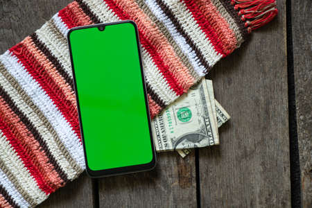 the phone with a green screen lies on a wooden background with a striped multicolored napkin and american money dollars