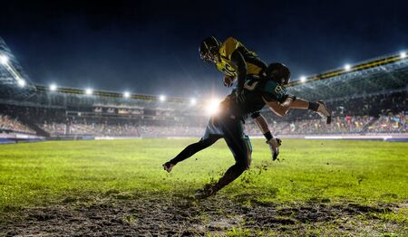 KHARKIV, UKRAINE - SEPTEMBER 26, 2020: American football players in action during match of Ukrainian Super League Atlantes Kharkiv vs. Slavs Kyiv