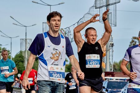 September 15, 2018 Minsk Belarus Half Marathon Minsk 2019 Happy marathon runners stand on the road before the start of the half marathon