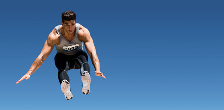 A sequence of a fit male athlete jumping in a sandpit competing in the long jump. Professional athlete or track racer during long or triple jump attempt is a competitive sports event or training