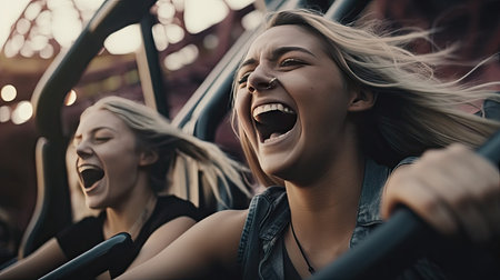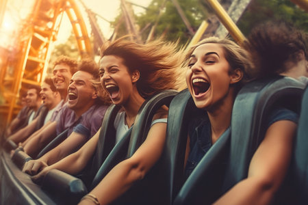 Young Friends Embracing Thrills on a Roller Coaster. Generative AI