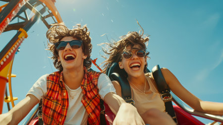 Two funny happy teenagers are riding a roller coaster and smiling. A young couple of a guy and a girl in an amusement park. The scene is joyful and cheerful. Summer entertainment