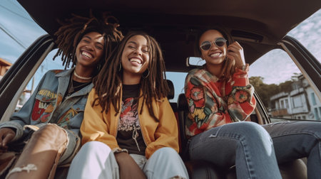 Carefree time with friends Happy young African woman looking out from the retro minivan while two her friends standing near her : Generative AI
