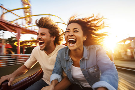Excited couple enjoying a thrilling, high-speed ride at an amusement park.