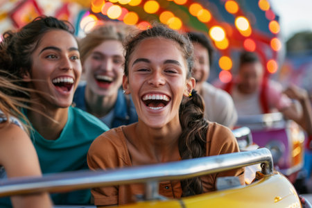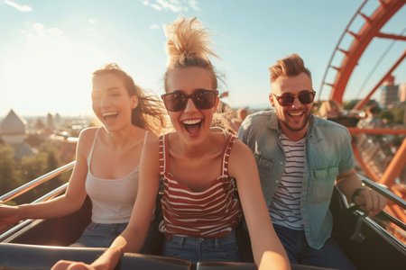 friends having a fun day at a theme park, with rides, games, and happy faces, highlighting leisure and adventure.