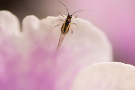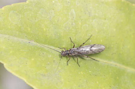 Plecoptera stone fly insect with long antennae and wings with black venation is used as bait for river fishing flash lighting
