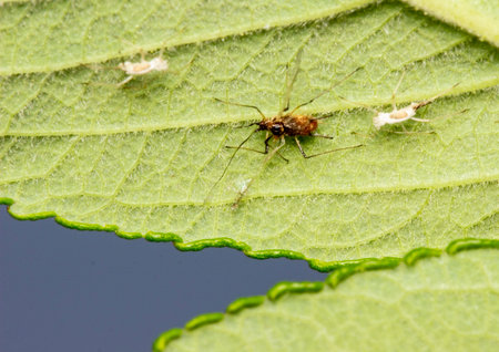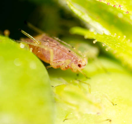 small aphid on a green leaf in the open air .