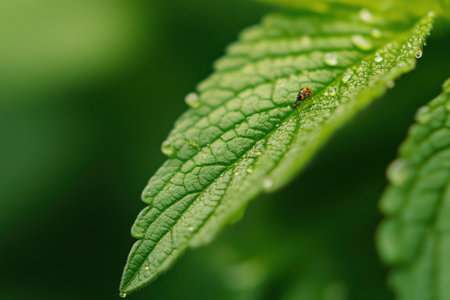 Stunning close-up of fresh green leaves adorned with dew drops and tiny insects, showcasing nature's delicate beauty and vibrant life in a garden setting.