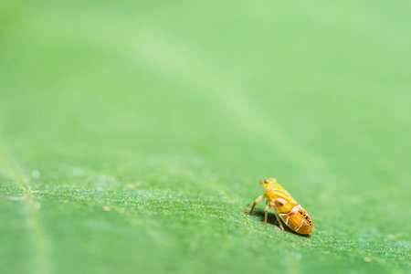 A yellow insect stands perched on a green leaf surrounded by blurred foliage in a soft glow of sunlight showcasing natures intricate details.