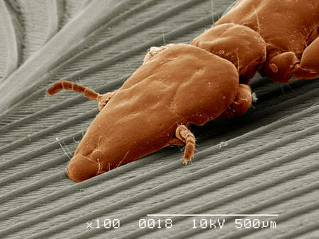 Duck louse, Phthiraptera, attached to feather SEM