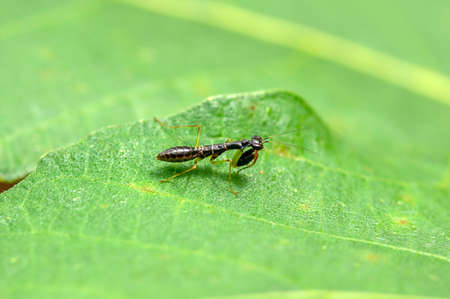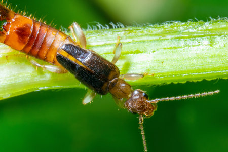 Rove beetle on top of a plant stem with greenish out of focus background