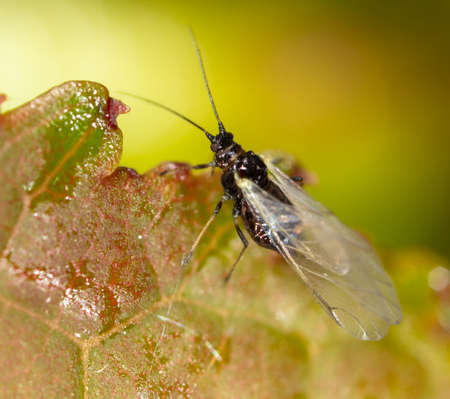 Aphid with wings on a leaf of a tree. Macro