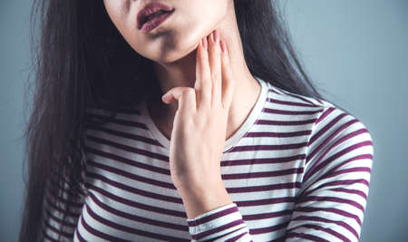 Woman have a sore throat,Female touching neck with hand,Healthcare Concepts