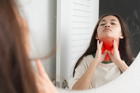 Young woman standing in front of mirror touching her sore throat with red pain area, showing symptoms of illness, throat infection, thyroid disease, or health problem requiring medical attention.