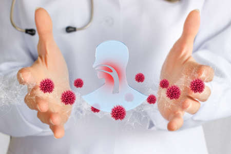 3D render of a medical background with male figure holding throat in pain with flu virus cells
